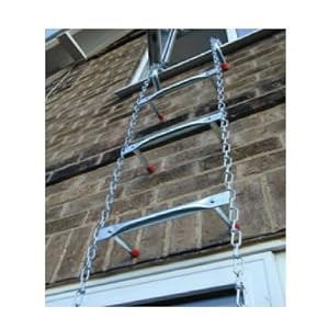 4-5 Story Portable Ladder - 45 ft (View our Model 1015 for 2 Story and 1025 for a 3 Story ladder) Made for wall thickness up to 10" deep Window width should be a minimum of 13" Suitable for most standard windows 11.5 inch wide rungs Chain tension tested to 1000 pounds in weight Manufactured of heavy duty zinc plated 18 gauge steel Designed for quick ; easy deployment with tangle free steel link chains Ladders store easily under bed or window Stand offs included to keep ladder away from building (quantity varies by model) Stand offs MUST be assembled by customer prior to use. Adjustable positioning of the stand offs can help avoid windows beneath. Ladders can be used more than once allowing for fire drills Limited Lifetime warranty