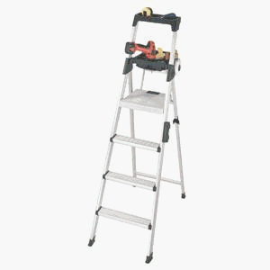 A lightweight premium aluminum ladder with large treads, large platform top step, work tray for tools, a top cap to hold fasteners and an easy one hand fold carries a ANSI Type 1A 300-pound Industrial duty rating.